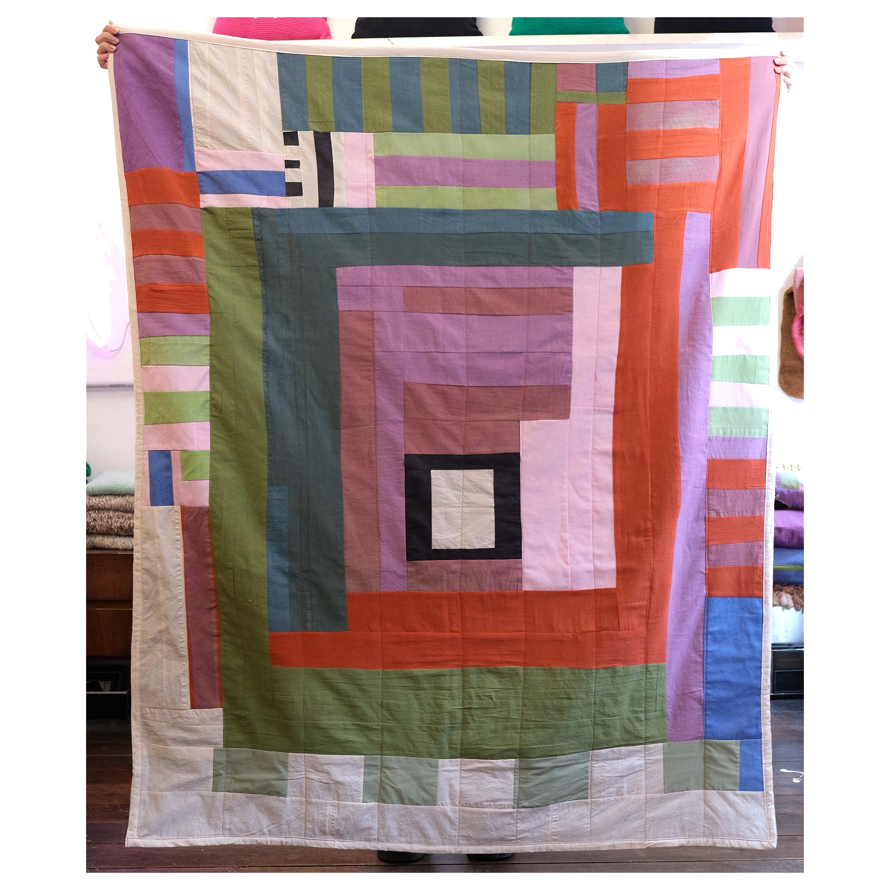 Wrap yourself in color with this handmade quilt pieced together from upcycled, over-dyed cotton fabric. A unique, one-of-a-kind piece of art that adds color and character to any room. Perfect for cozying up or brightening your space with a playful, eco-friendly touch. Lined with a thin wool batting and fully backed in natural, undyed cotton. A hanging sleeve for wall display can be added to the back upon request.